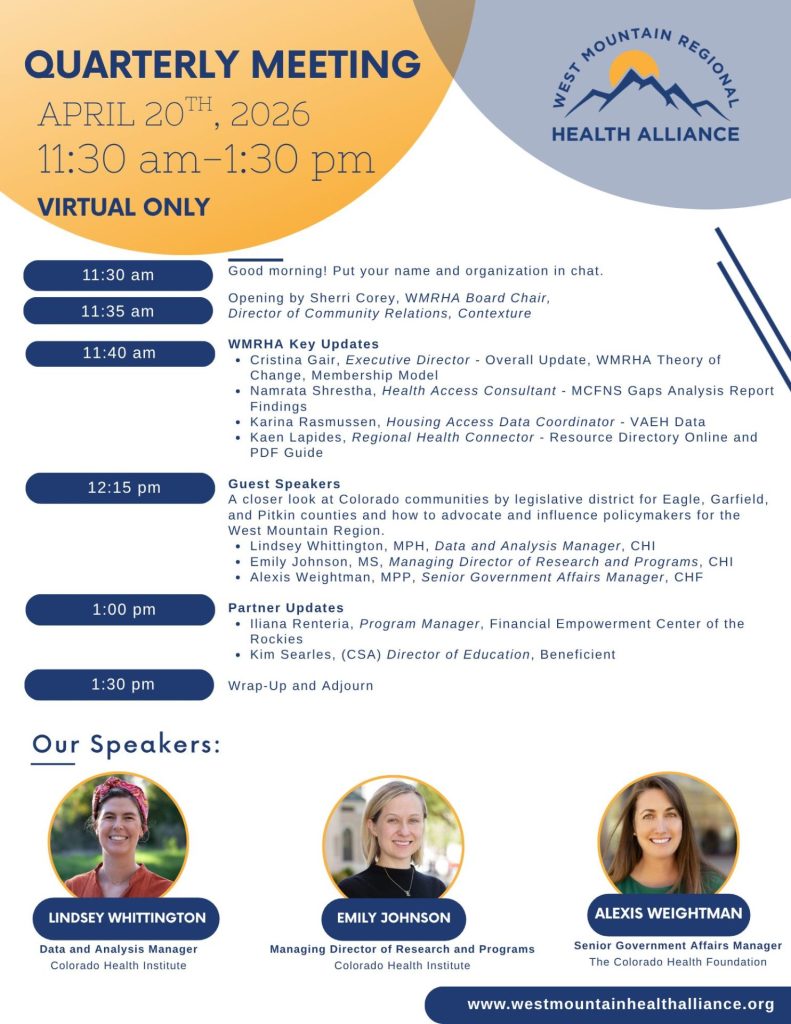 The West Mountain Regional Health Alliance (WMRHA) will convene its April Quarterly Meeting on Monday, April 20, 2026, from 11:30 AM to 1:30 PM (MT). This virtual gathering will focus on advancing regional health priorities…